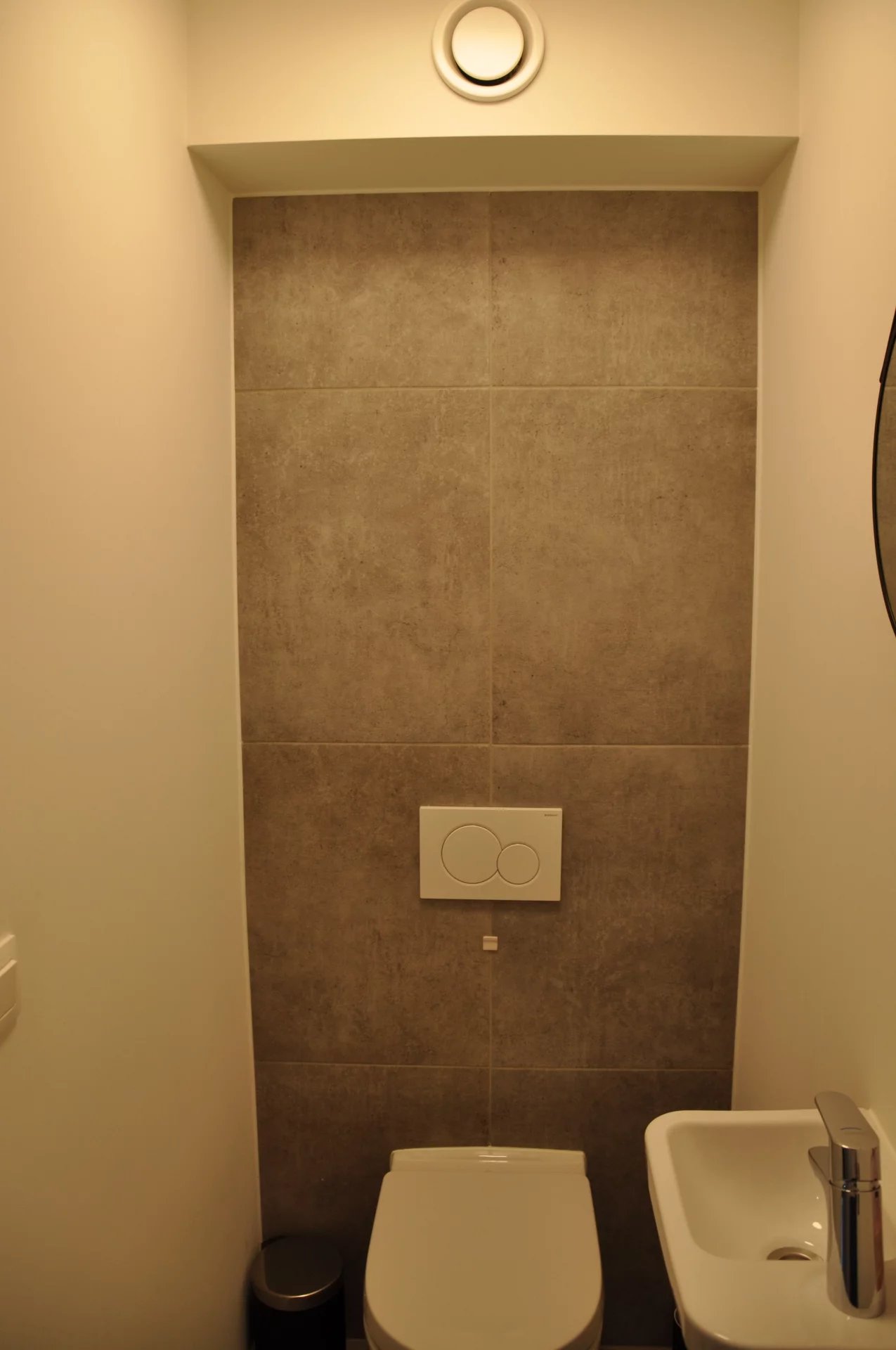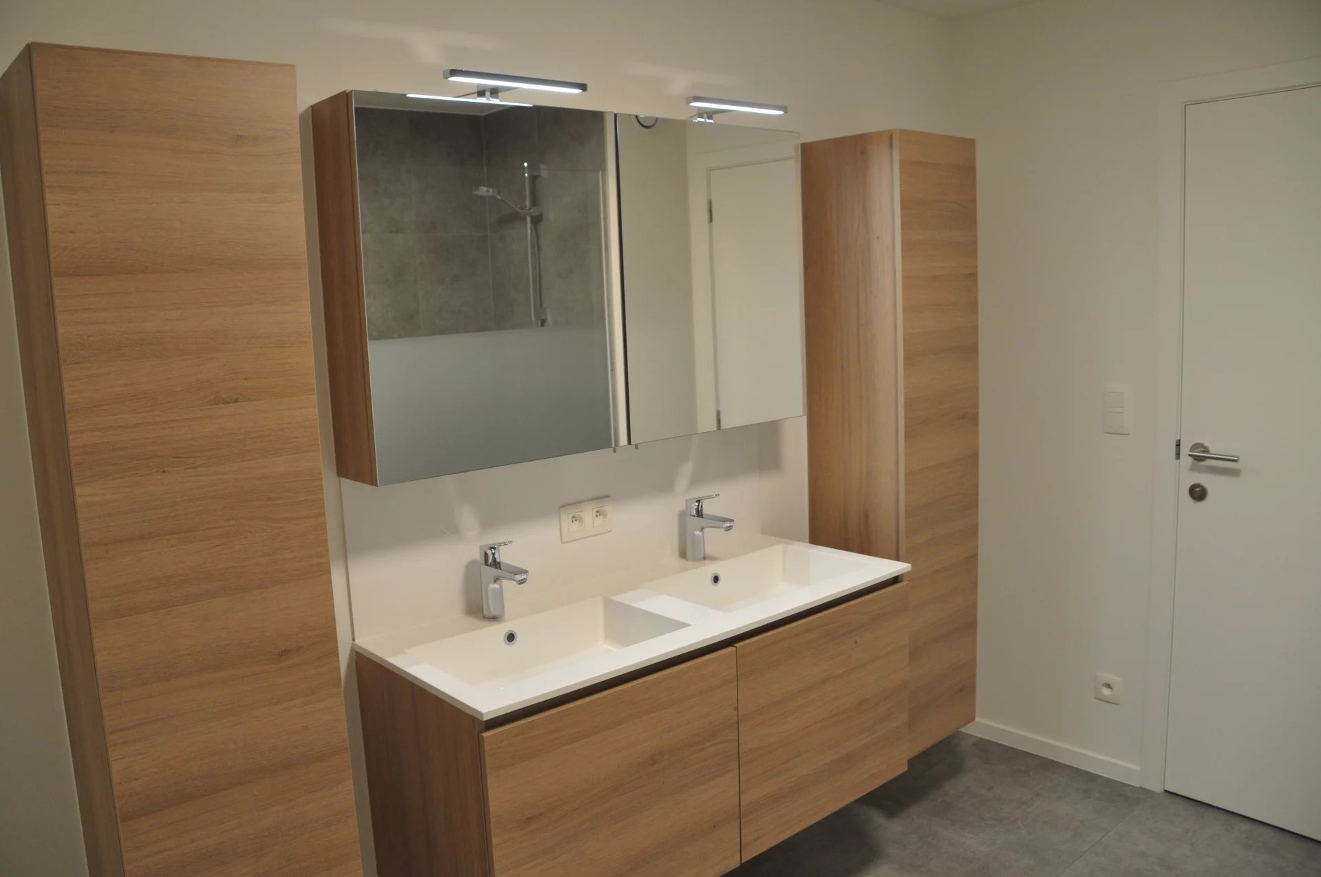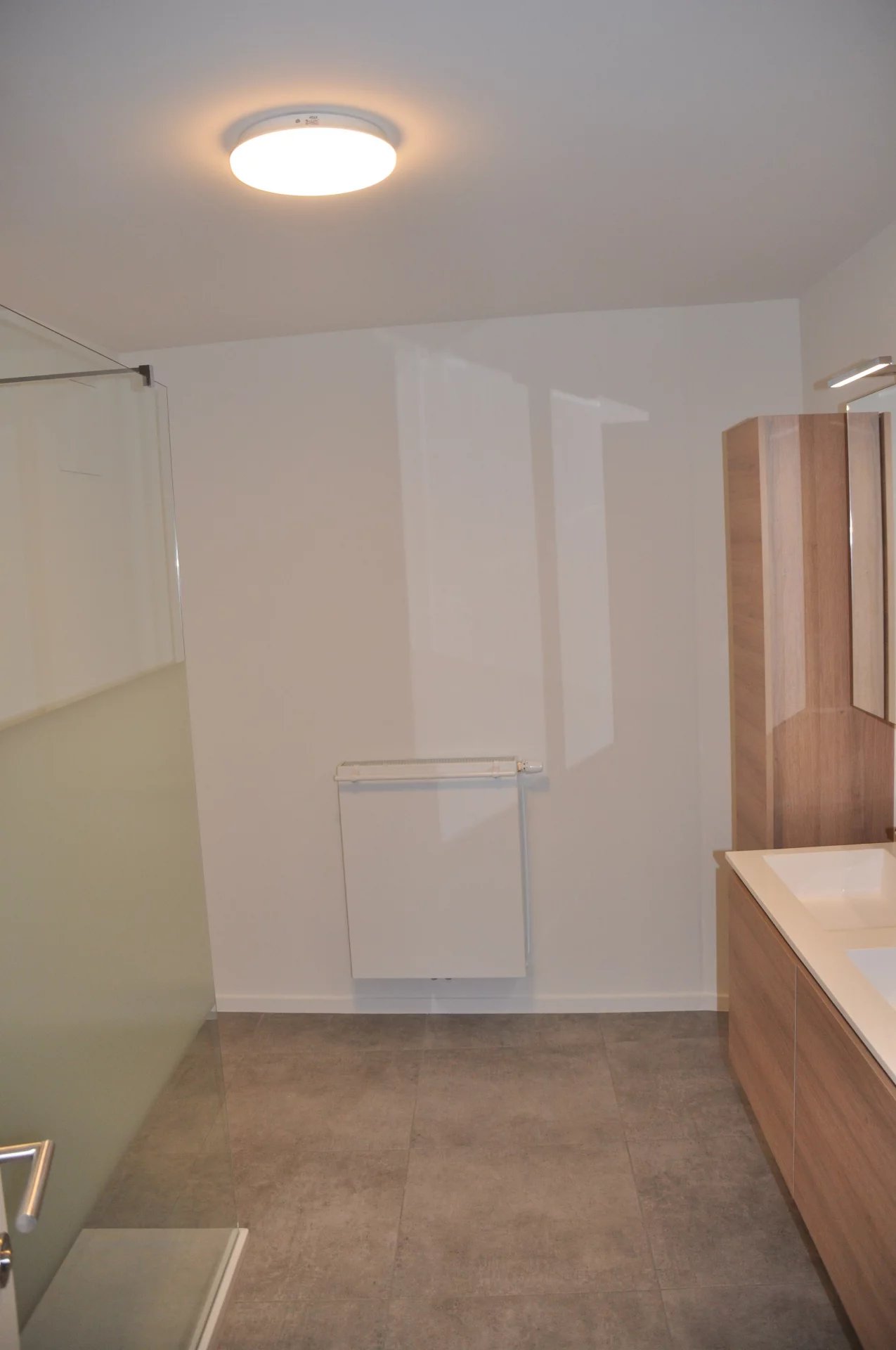 De inkomhal geeft verder uit op het aparte toilet, de uitgeruste badkamer en de twee slaapkamers. De badkamer is voorzien van een dubbele wastafel met spiegel- en kolomkasten alsook een ruime inloopdouche. De twee slaapkamers bevinden zich bovendien aan de achterzijde waardoor rust gegarandeerd is.