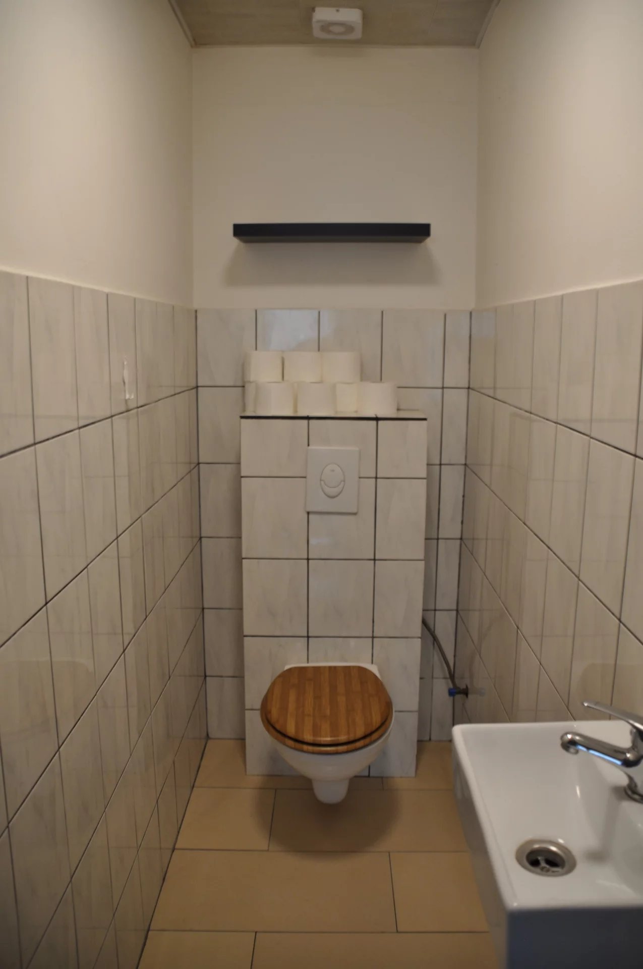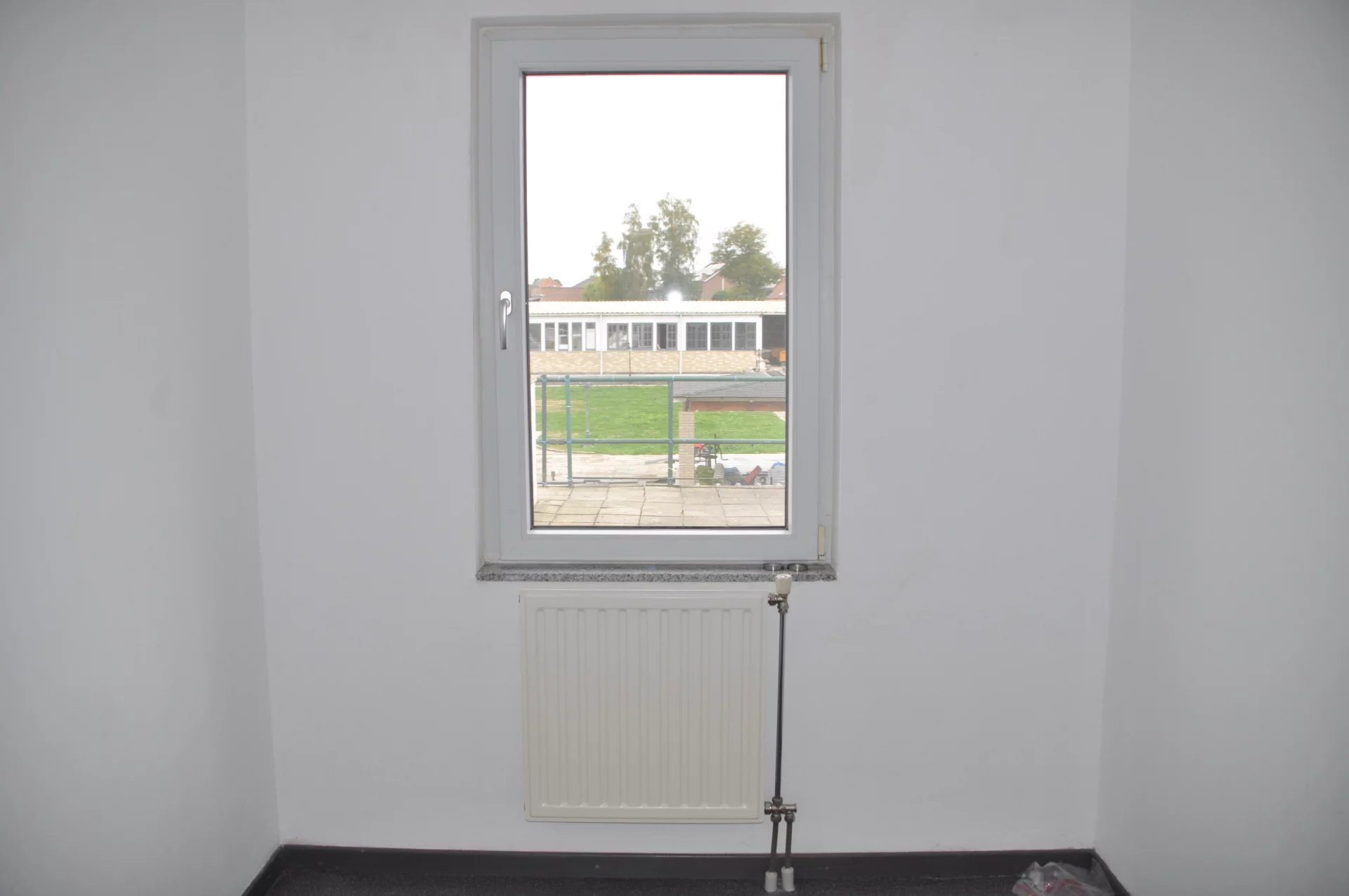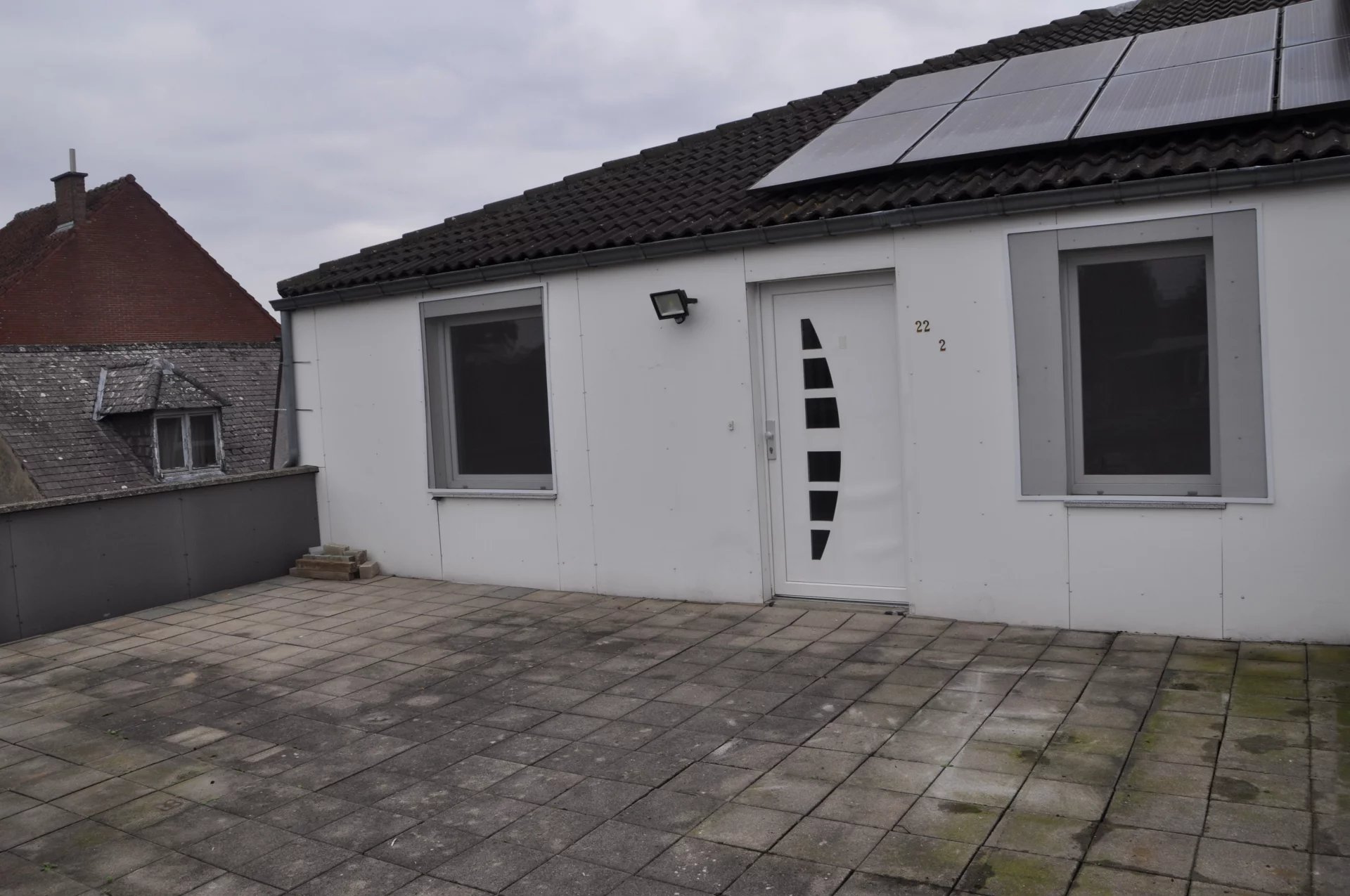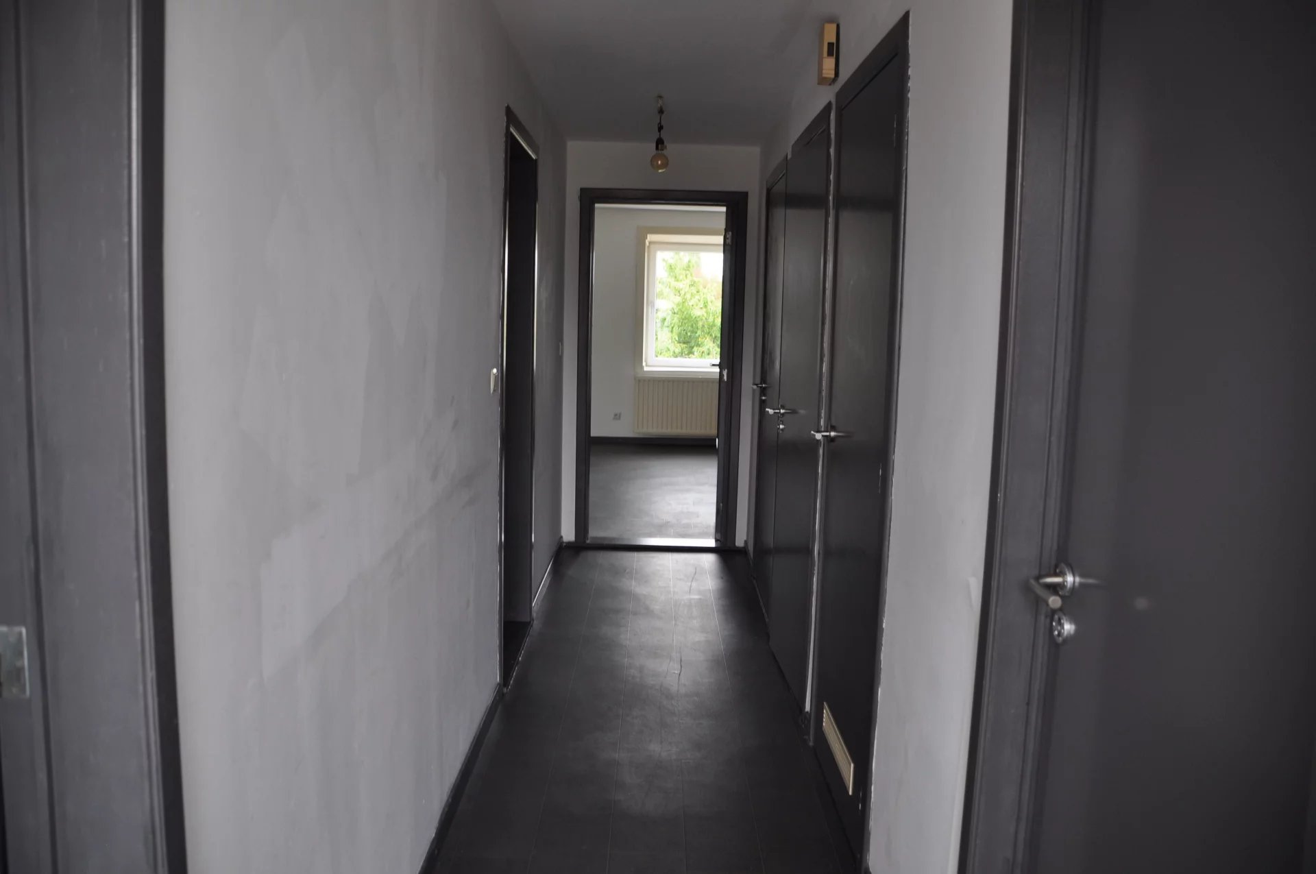 De toegang is gelegen aan de achterzijde van het gebouw met een buitentrap, enkel naar de twee appartementen op de eerste verdieping. U komt binnen langs de terraszijde met uw eigen voordeur. Het terras is ruim, heeft een oppervlakte van 35 m² en een westelijke oriëntatie. De hal verbindt alle kamers met elkaar en geeft toegang tot de drie slaapkamers (tweemaal 12,5m² en éénmaal 6,40 m²), het apart toilet met handwasbakje, berging en badkamer. In de badkamer is er een bad aanwezig, een enkele wastafel en de aansluitingen voor de wasmachine. Aan de straatzijde is de leefruimte met open keuken aanwezig. Deze is lichtrijk dankzij de grote raampartijen en aangenaam in oppervlakte. De keuken zelf is voornamelijk uit kastruimte, wastafel, kookplaat en dampkap (andere toestellen zijn niet aanwezig).